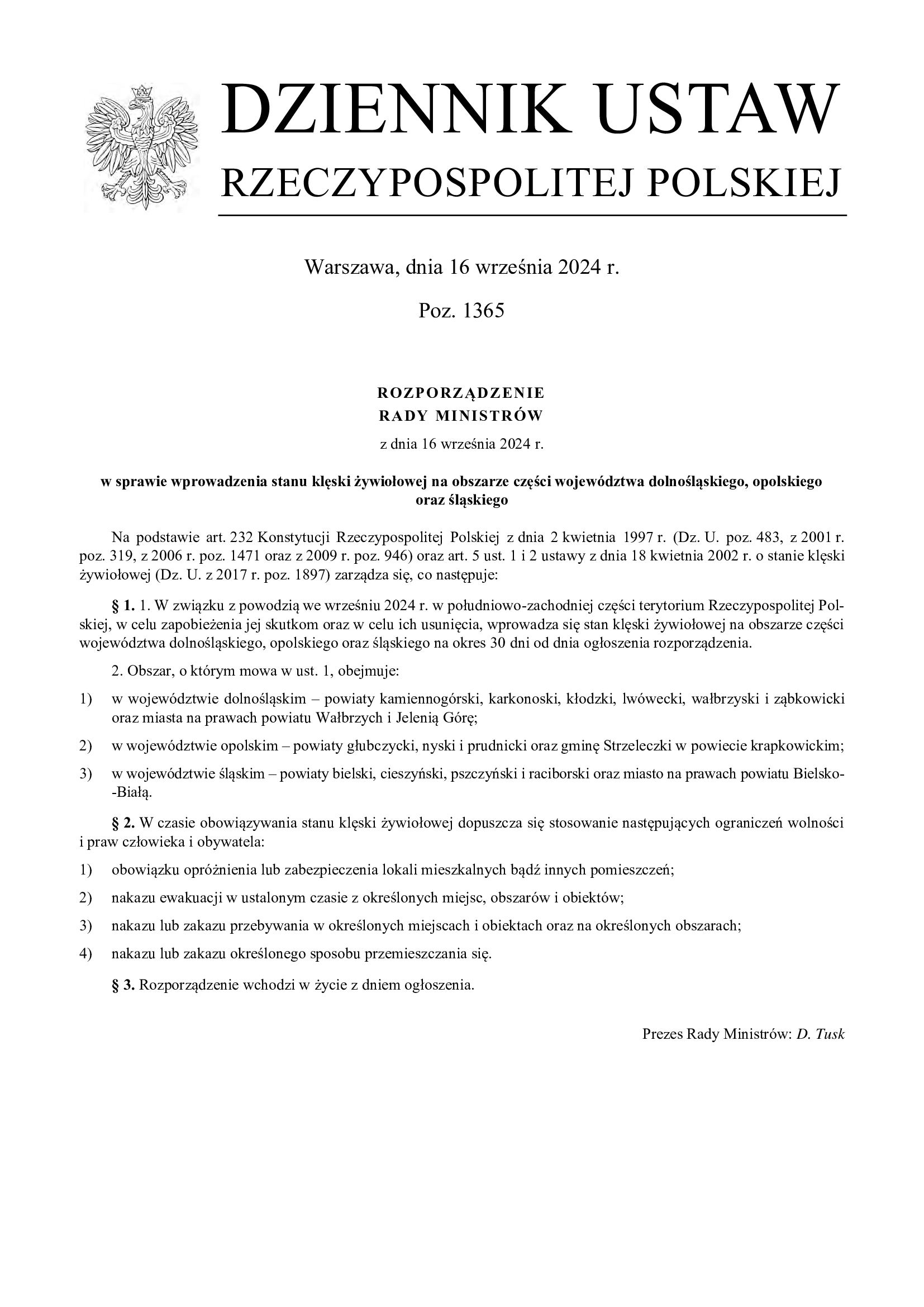 ROZPORZĄDZENIE RADY MINISTRÓW z dnia 16 września 2024 r. w sprawie wprowadzenia stanu klęski żywiołowej na obszarze części województwa dolnośląskiego, opolskiego i śląskiego