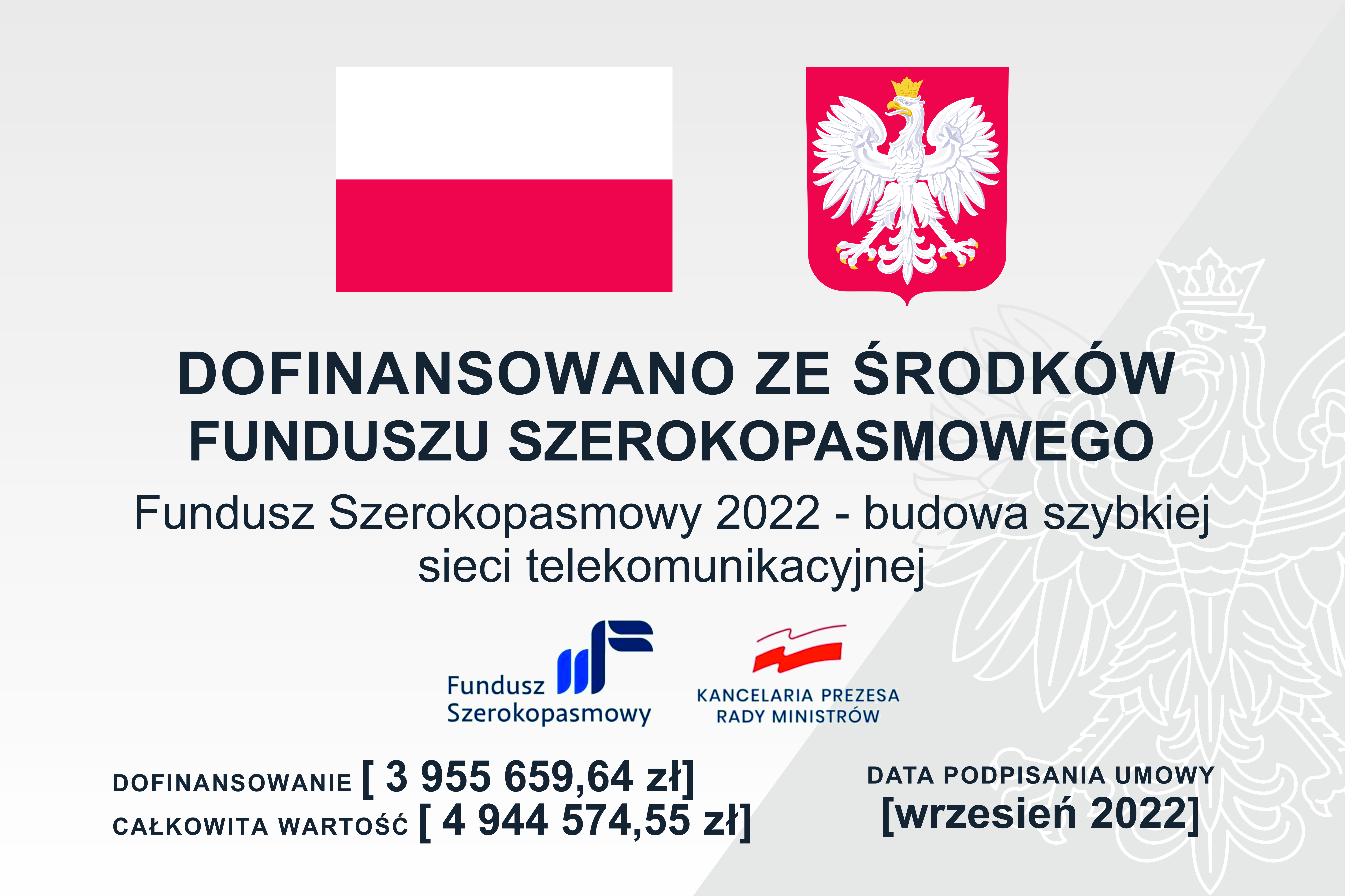Kwota dofinansowania ze środków Funduszu Szerokopasmowego – państwowego funduszu celowego w ramach Pilotażowego Programu „Fundusz Szerokopasmowy 2022”: 3 955 659,64 zł.