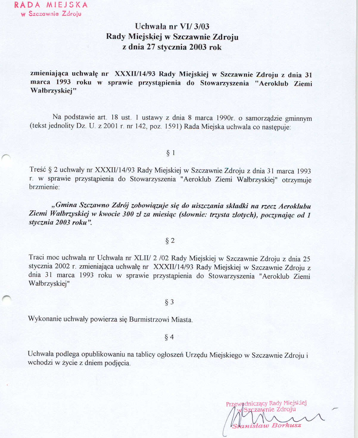 Uchwała nr VI/3/03 Rady Miejskiej w Szczawnie Zdroju z dnia 27 stycznia zmieniająca Uchwałę nr XXXII/14/93 z dnia 31 marca 1993 r. w sprawie przystapienia do Stowarzyszenia Aeroklub Ziemi Wałbrzyskiej