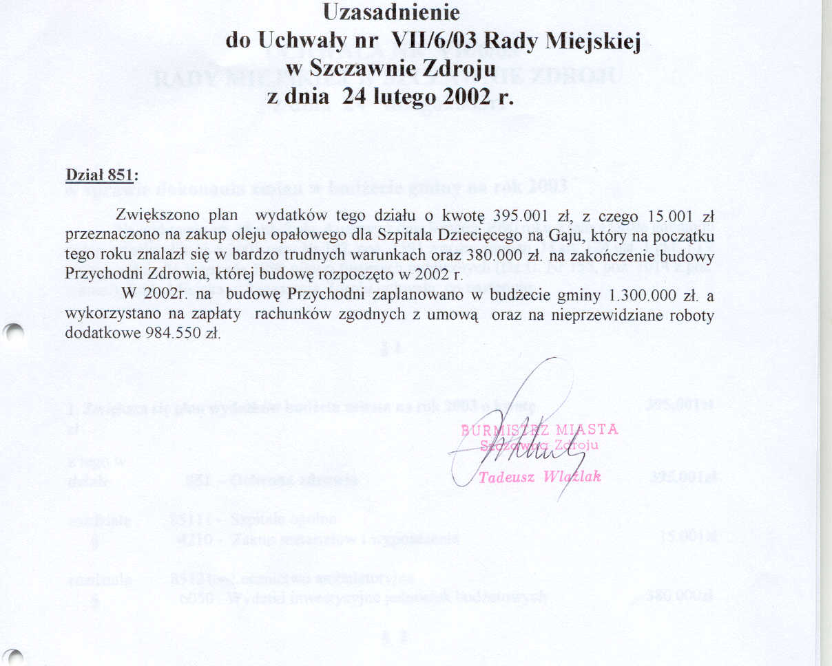 Uchwała nr VII/6/03 Rady Miejskiej w Szczawnie Zdroju z dnia 24 lutego 2003 roku - w sprawie dokonania zmian w budżecie miasta na rok 2003