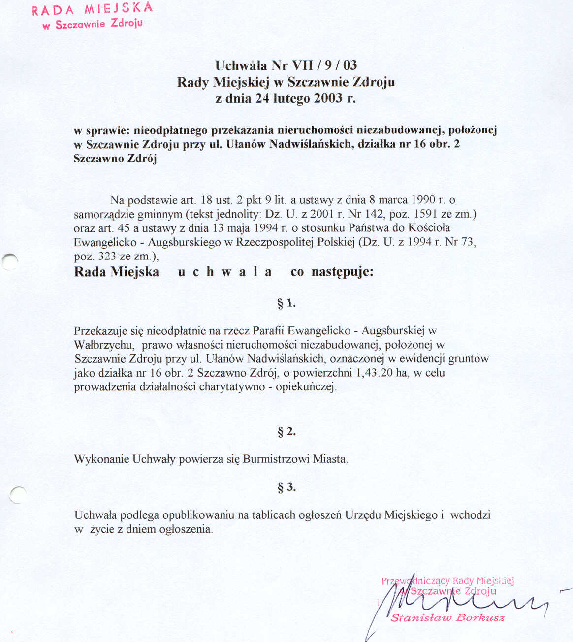 Uchwała nr VII/9/03 Rady Miejskiej w Szczawnie Zdroju z dnia 24 lutego 2003 roku - w sprawie nieodpłatnego przekazania nieruchomości niezabudowanej położonej przy ul. Ułanów Nadwiślańskich