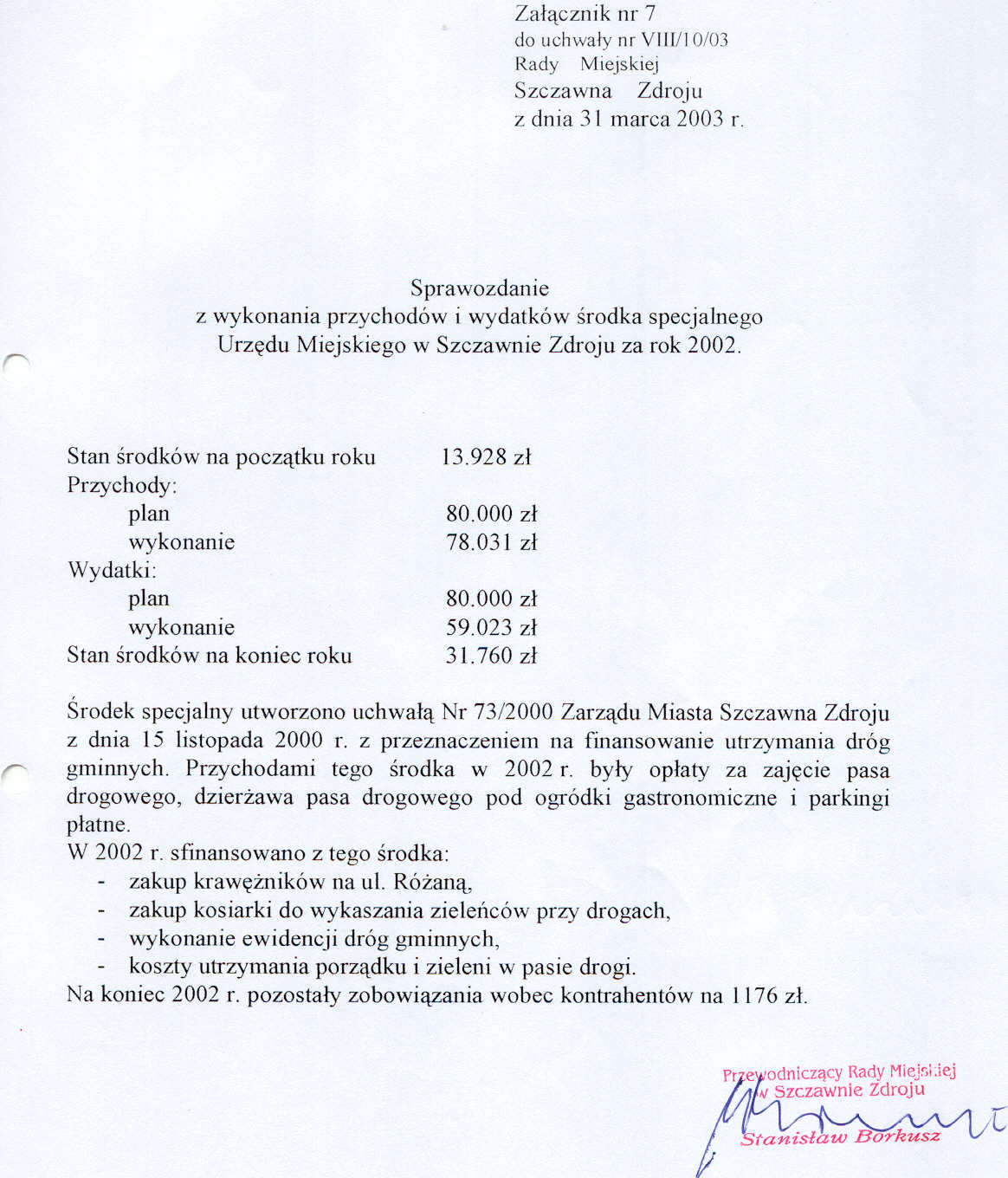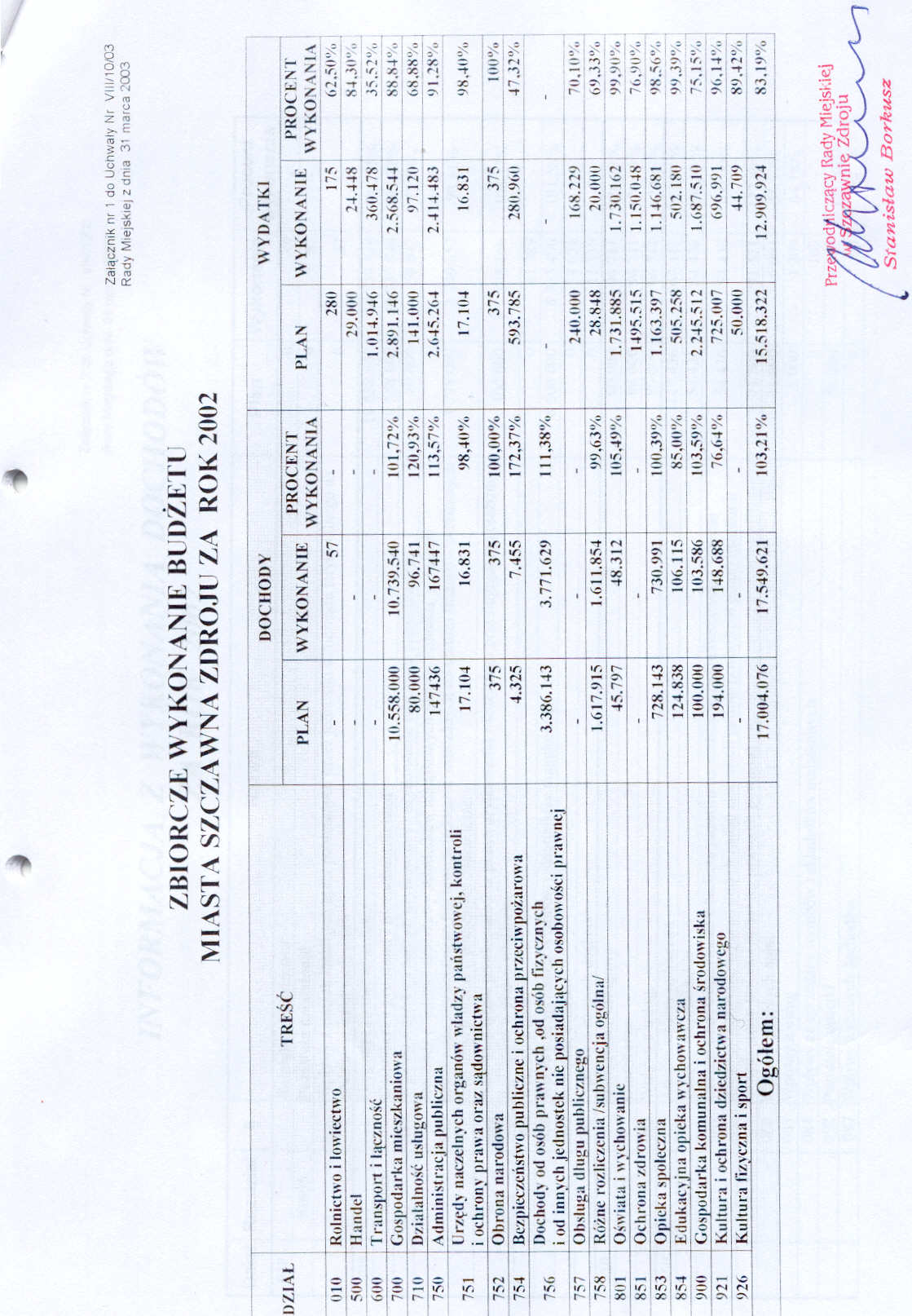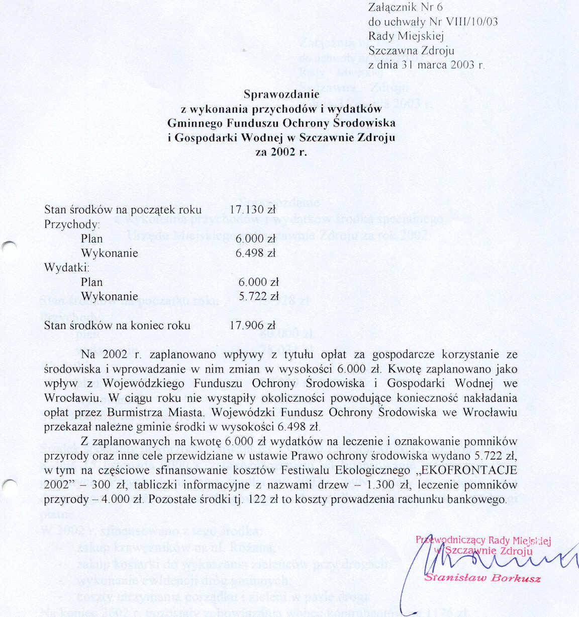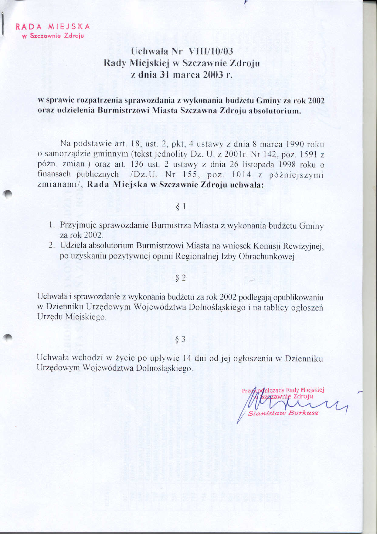Uchwała nr VIII/10/03 Rady Miejskiej w Szczawnie Zdroju z dnia 31 marca 2003 roku - w sprawie rozpatrzenia sprawozdania z wykonania budżetu gminy za rok 2002 oraz udzielenia absolutorium Burmistrzowi