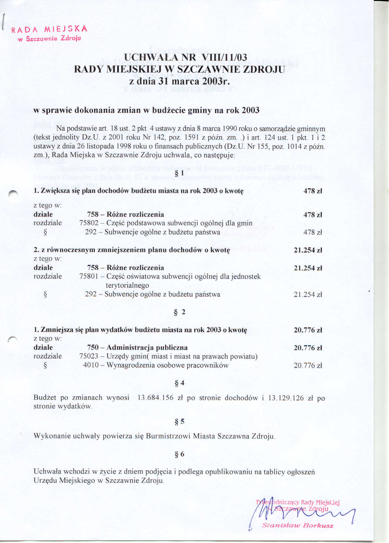 Uchwała nr VIII/11/03 Rady Miejskiej w Szczawnie Zdroju z dnia 31 marca 2003 roku - w sprawie zmian w budżecie gminy na rok 2003