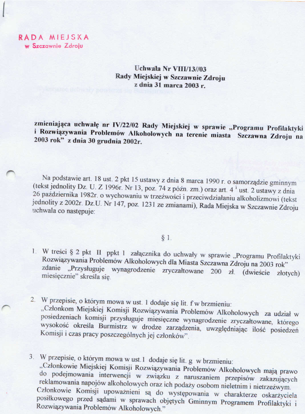 Uchwała nr VIII/13/03 Rady Miejskiej w Szczawnie Zdroju z dnia 31 marca 2003 roku zmieniająca Uchwałę nr IV/22/02 w sprawie \"Programu Profilaktyki i Rozwiązywania Problemów Alkoholowych\"