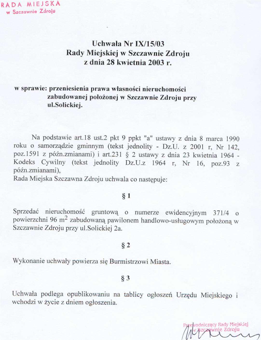 Uchwała nr IX/15/03 Rady Miejskiej w Szczawnie Zdroju z dnia 28 kwietnia 2003 roku - w sprawie przeniesienia prawa własności nieruchomości zabudowanej położonej w Szczawnie Zdroju przy ul. Solickiej