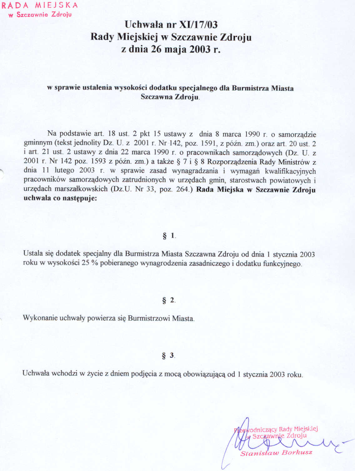 Uchwała nr XI/17/03 Rady Miejskiej w Szczawnie Zdroju z dnia 26 maja 2003 roku - w sprawie ustalenia wysokości dodatku specjalnego dla Burmistrza Miasta Szczawna Zdroju