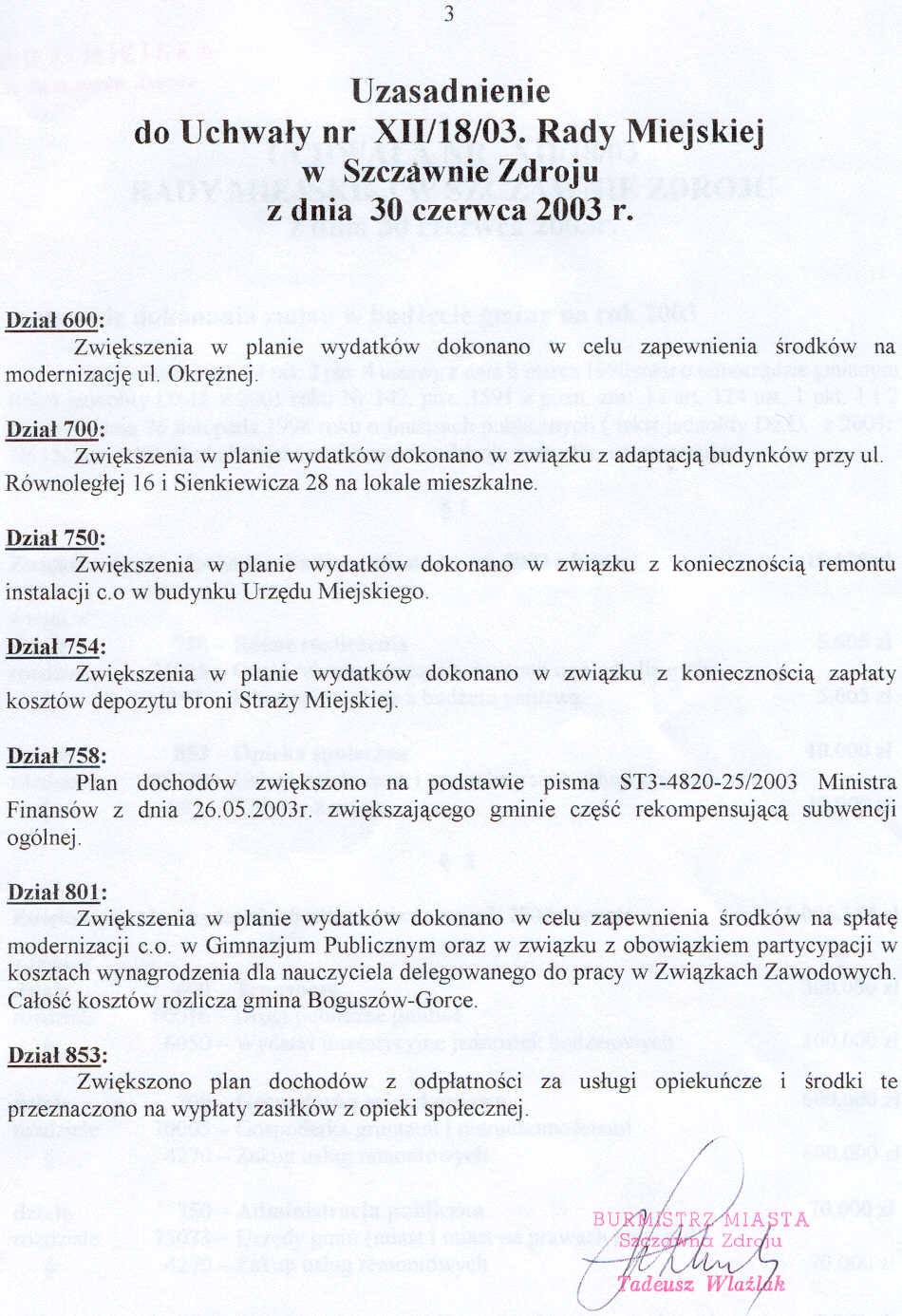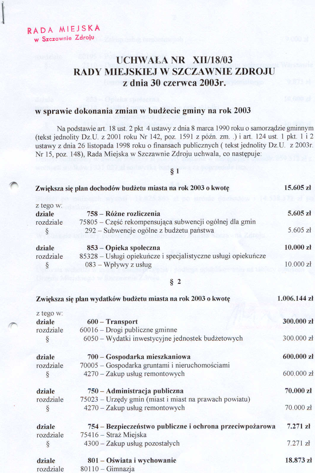 Uchwała nr XII/18/03 Rady Miejskiej w Szczawnie Zdroju z dnia 30 czerwca 2003 roku - w sprawie dokonania zmian w budżecie gminy na rok 2003