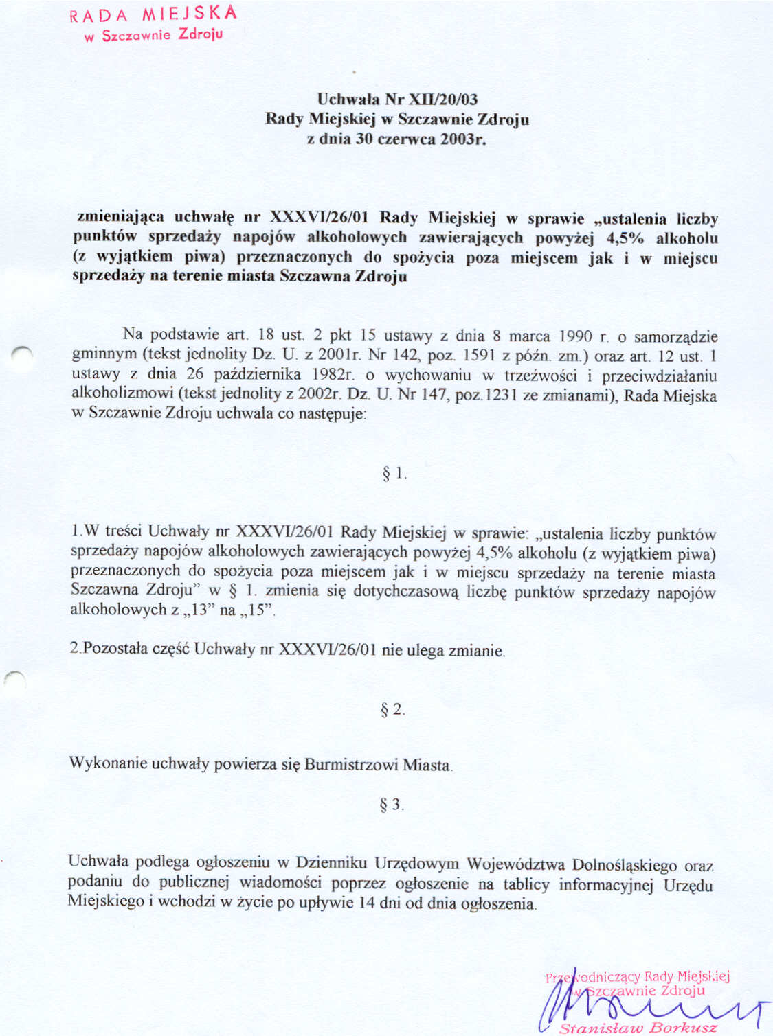 Uchwała nr XII/20/03 Rady Miejskiej w Szczawnie Zdroju z dnia 30 czerwca 2003 roku zmieniająca Uchwałę nr XXXVI/26/01 w sprawie ustalenia liczby punktów sprzedaży napojów alkoholowych