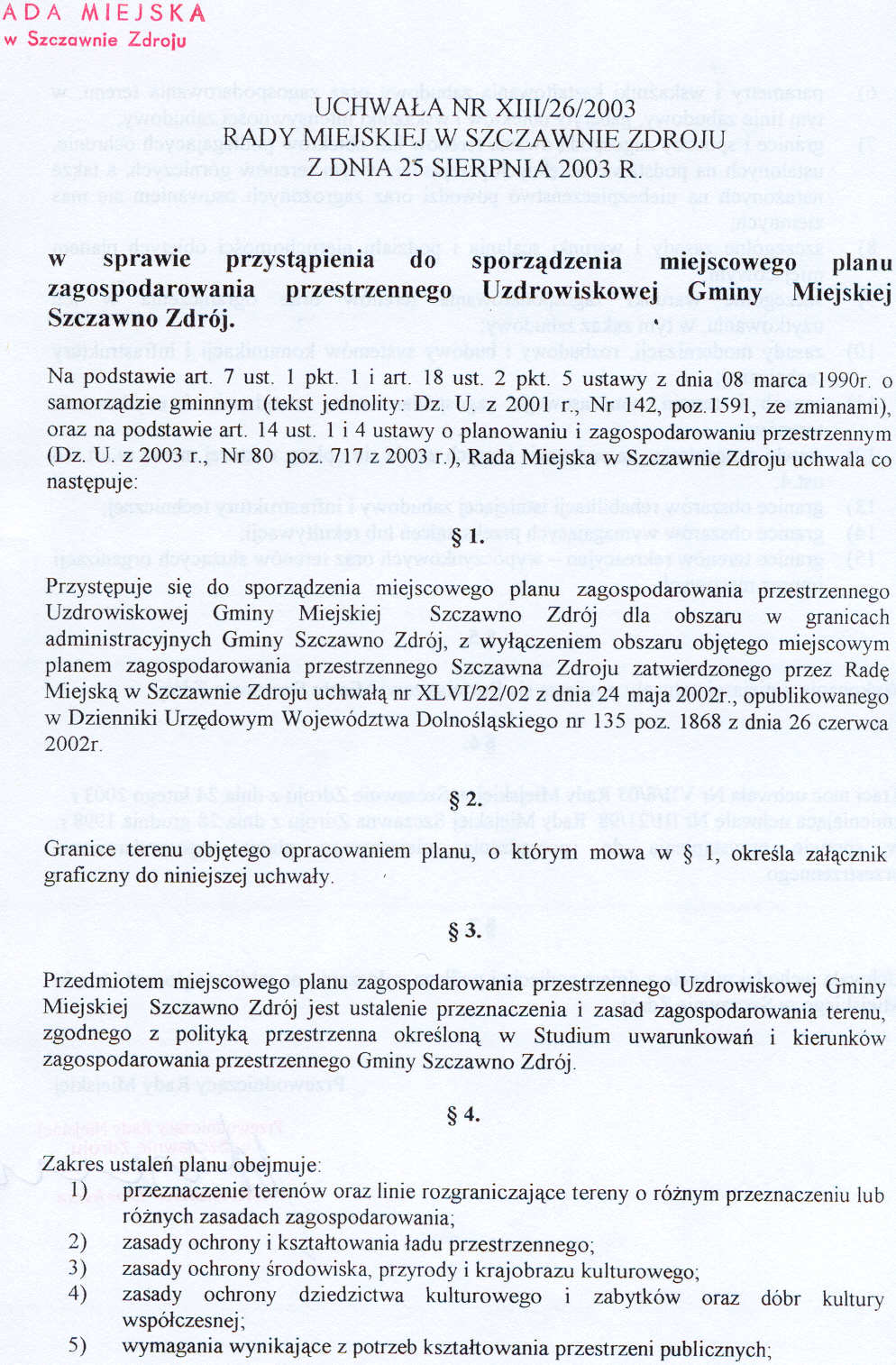 Uchwała nr XIII/26/03 Rady Miejskiej w Szczawnie Zdroju z dnia 25 sierpnia 2003 roku - w sprawie przystąpienia do sporządzenia miejscowego planu zagospodarowania przestrzennego Uzdrowiskowej Gminy