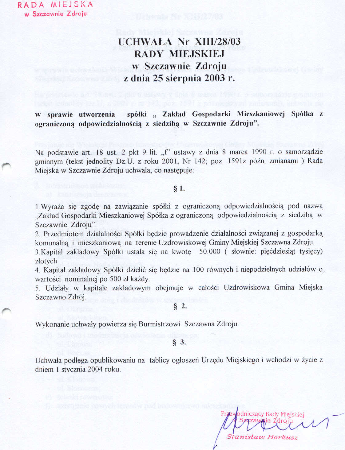 Uchwała nr XIII/28/03 Rady Miejskiej w Szczawnie Zdroju z dnia 25 sierpnia 2003 roku - w sprawie utworzenia spółki Zakład Gospodarki Mieszkaniowej - Spółka z ograniczoną odpowiedzialnościa