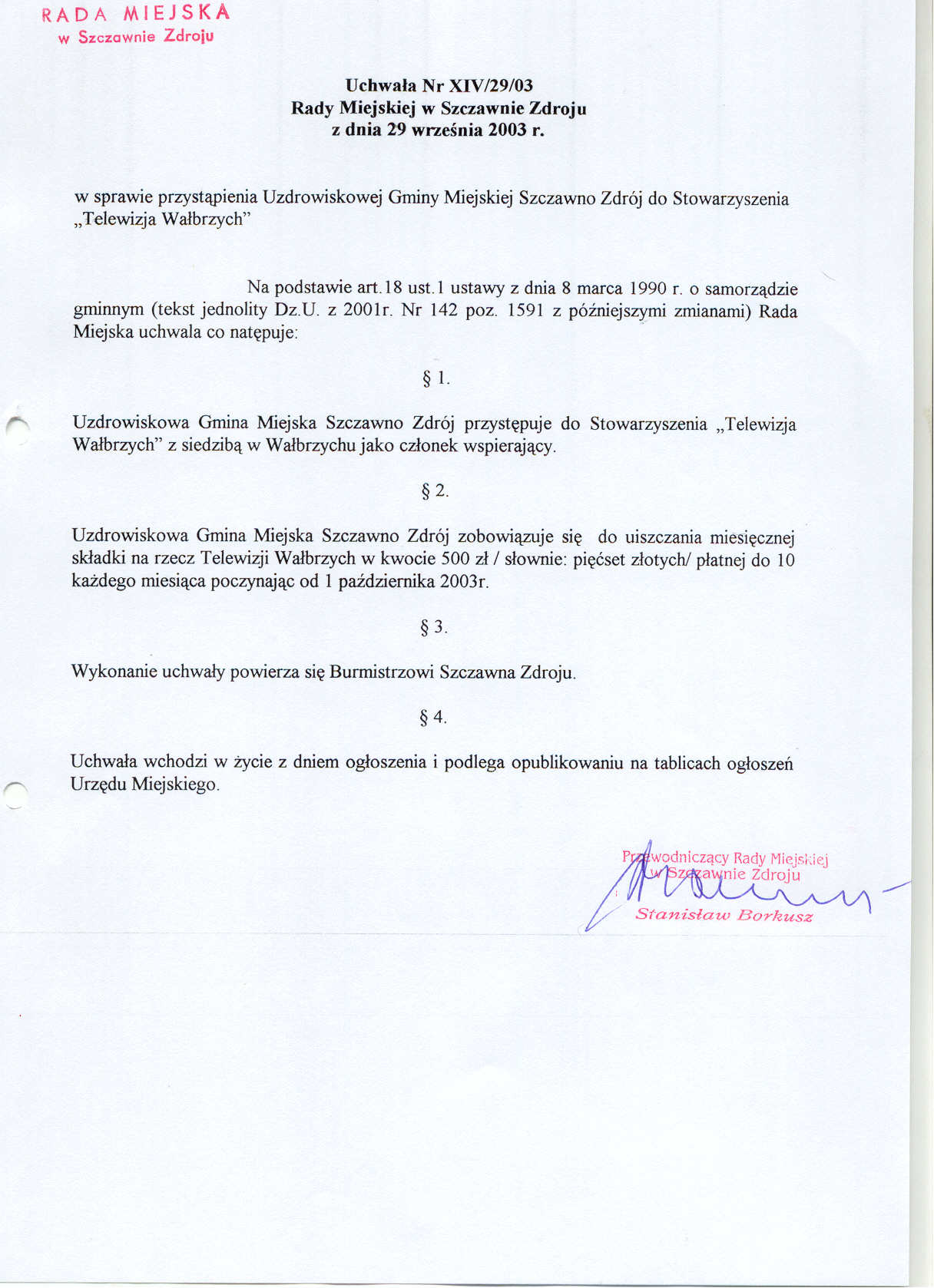Uchwała nr XIV/29/03 Rady Miejskiej w Szczawnie Zdroju z dnia 29 września - w sprawie przystąpienia Uzdrowiskowej Gminy Miejskiej Szczawno Zdrój do Stowarzyszenia Telewizja Wałbrzych