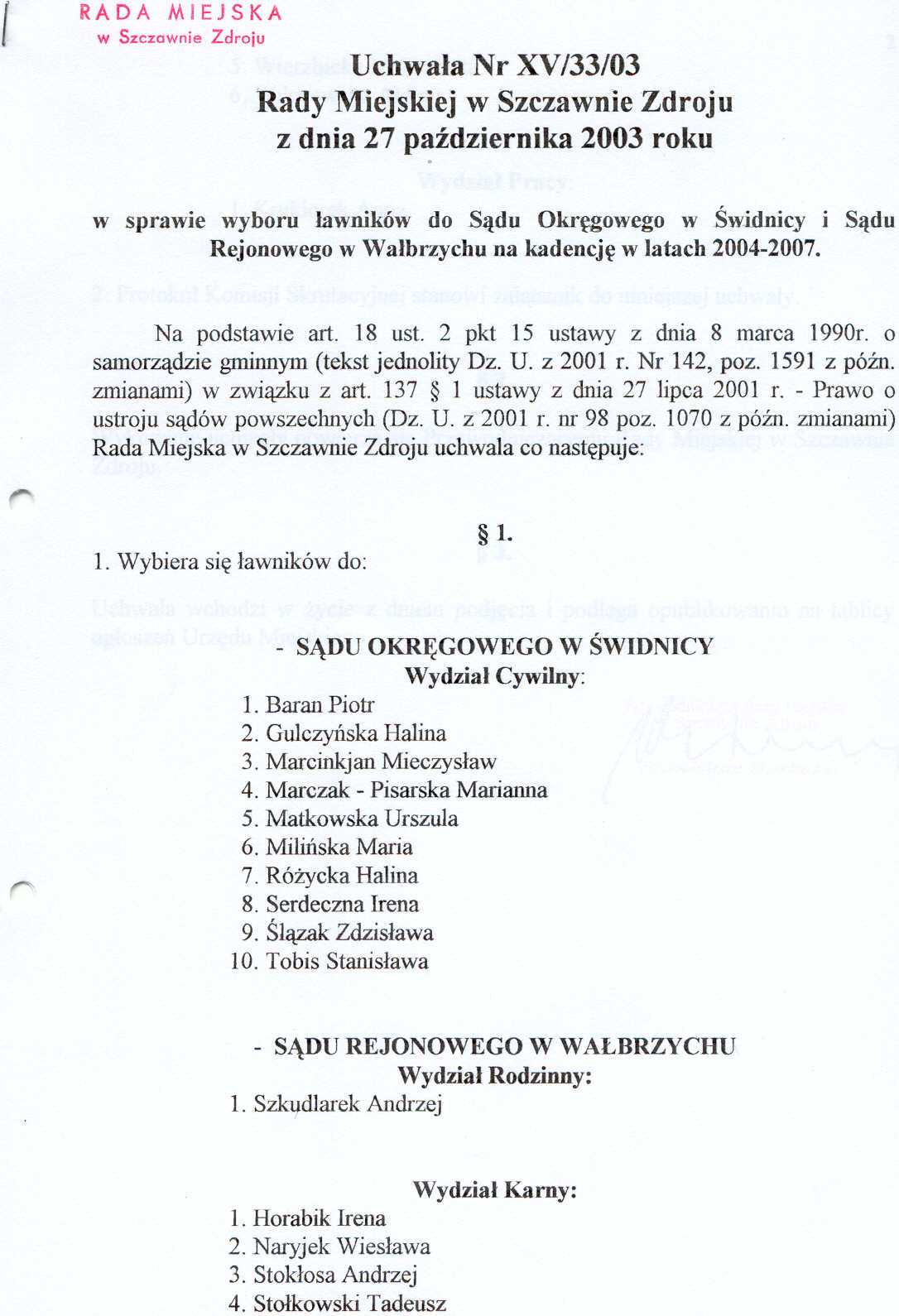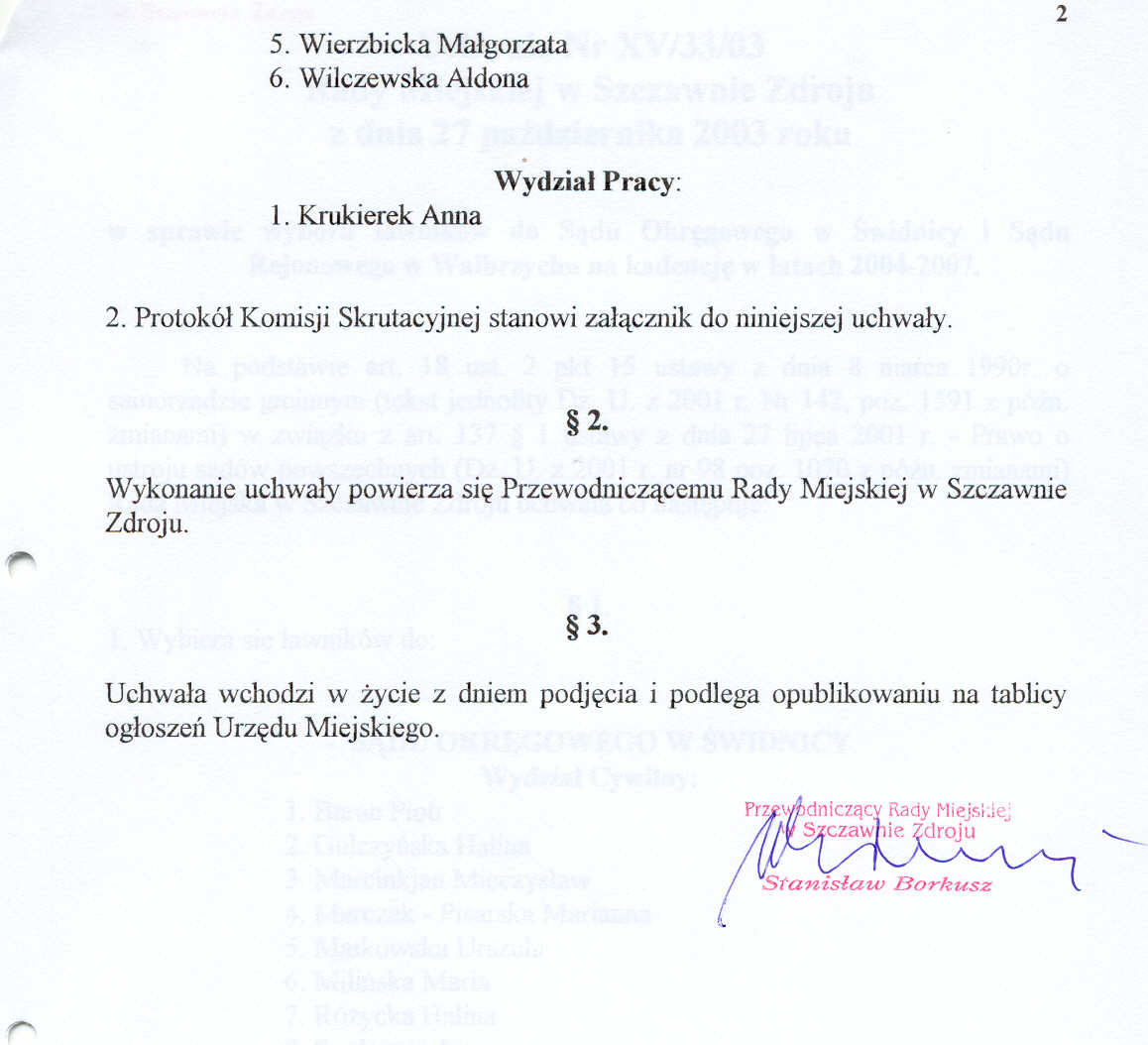 Uchwała nr XV/33/03 Rady Miejskiej w Szczawnie Zdroju z dnia 27 października 2003 roku - w sprawie wyboru ławników do Sądu Okręgowego w Świdnicy i Sądu Okręgowego w Wałbrzychu na kadencję w latach