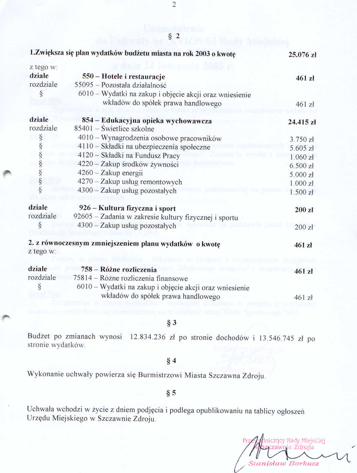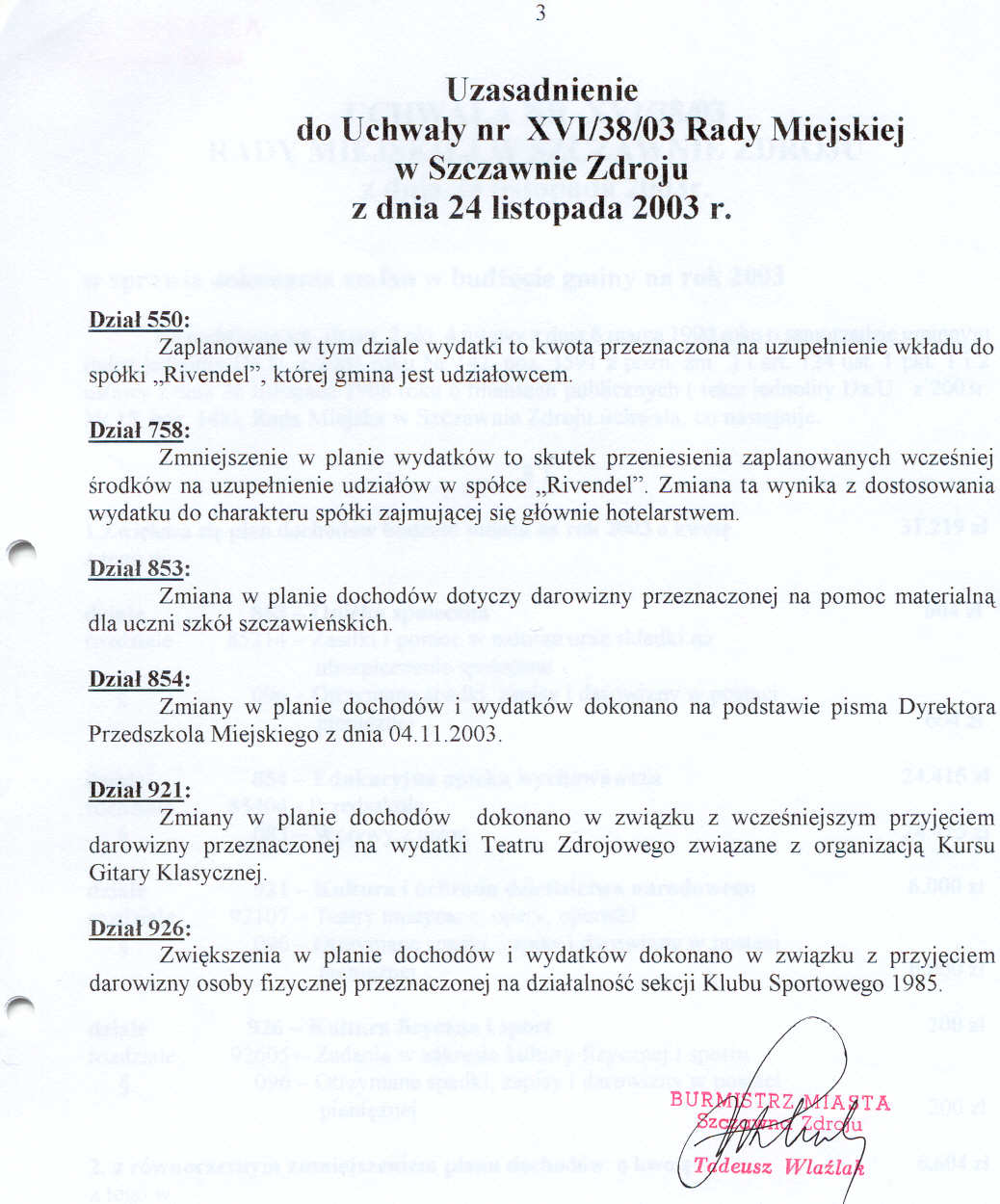 Uchwała nr XVI/38/03 Rady Miejskiej w Szczawnie Zdroju z dnia 24 listopada 2003 roku - w sprawie dokonania zmian w budżecie gminy na rok 2003