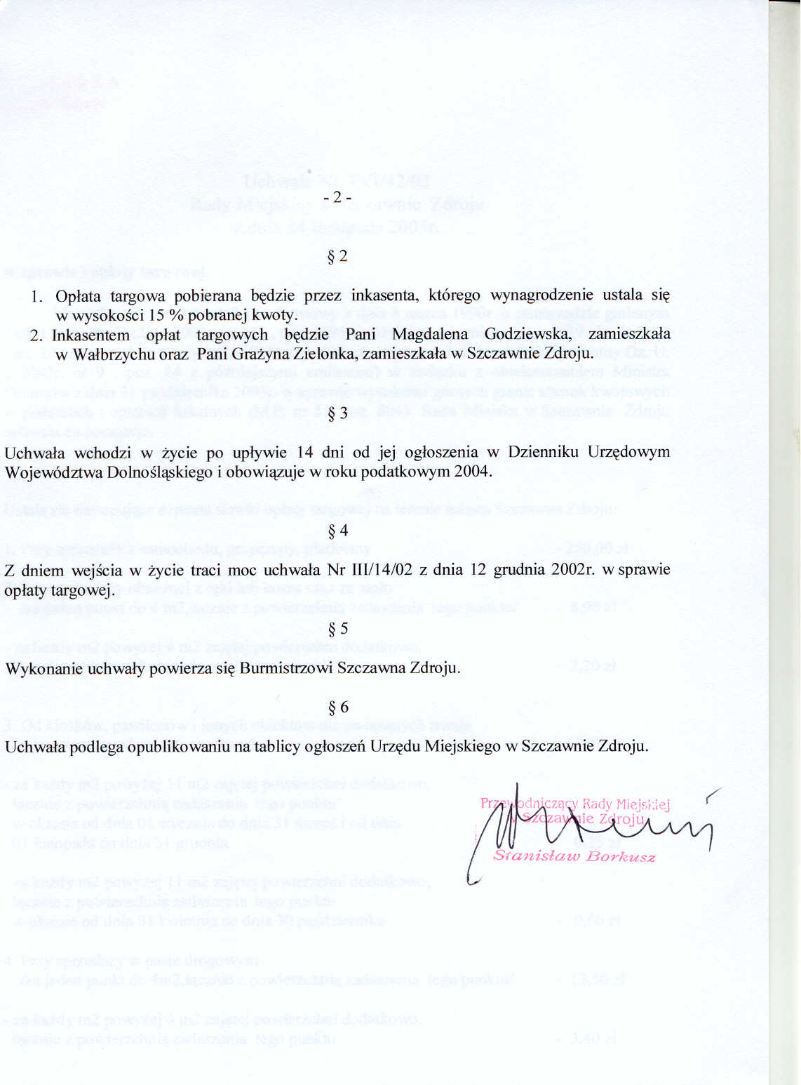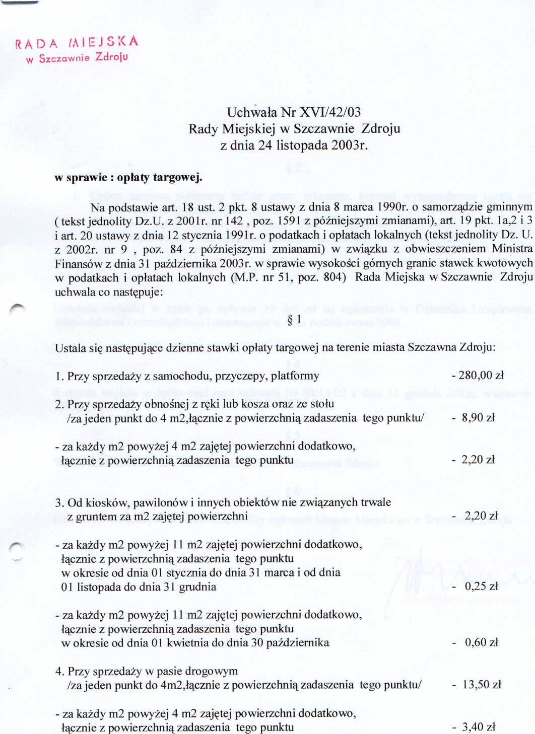 Uchwała nr XVI/42/03 Rady Miejskiej w Szczawnie Zdroju z dnia 24 listopada 2003 roku - w sprawie opłaty targowej