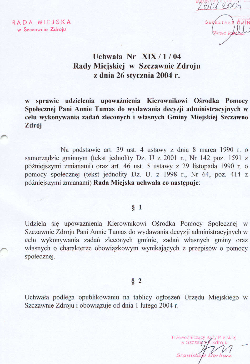 Uchwała nr XIX/1/04 Rady Miejskiej w Szczawnie Zdroju z dnia 26 stycznia 2004 r. w sprawie udzielenia upoważnienia Kierownikowi Ośrodka Pomocy Społecznej Pani Annie Tumas do wydawania decyzji