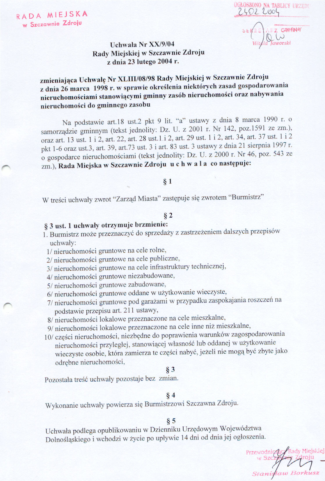 Uchwała nr XX/9/04 Rady Miejskiej w Szczawnie Zdroju z dnia 23 lutego 2004 r. zmieniająca Uchwałę nr XLIII/08/98 w sprawie określenia niektórych zasad gospodarowania nieruchomościami stanowiącymi