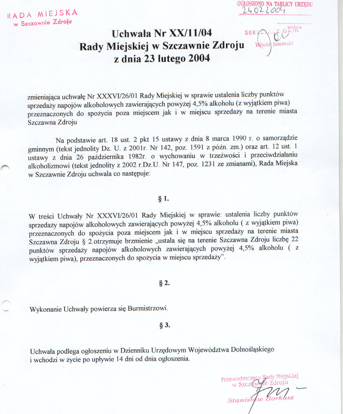 Uchwała nr XX/11/04 Rady Miejskiej w Szczawnie Zdroju z dnia 23 lutego 2004 r. zmieniająca Uchwałę nr XXXVI/26/01 w sprawie ustalenia liczby punktów sprzedaży napojów alkoholowych (z wyjątkiem piwa)