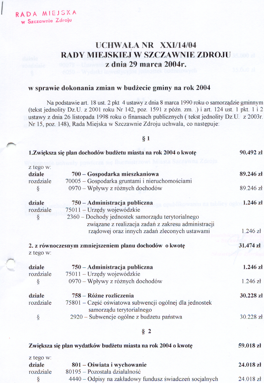 Uchwała nr XXI/14/04 Rady Miejskiej w Szczawnie Zdroju z dnia 29 marca 2004 r. w sprawie dokonania zmian w budżecie gminy na rok 2004