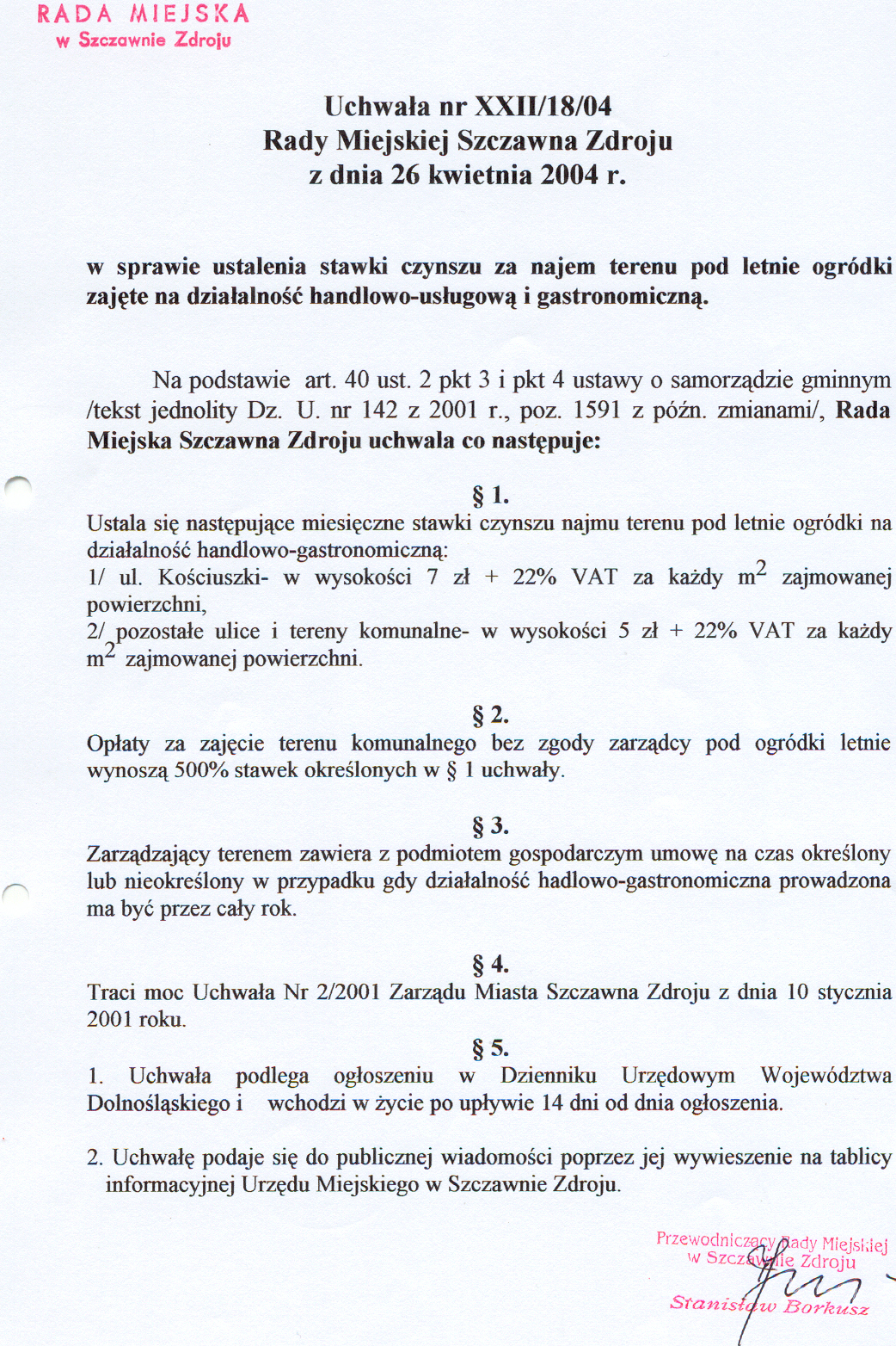 Uchwała nr XXII/18/04 Rady Miejskiej w Szczawnie Zdroju z dnia 26 kwietnia 2004 r. w sprawie ustalenia stawki czynszu za najem terenu pod letnie ogródki zajęte na działalność handlowo-usługową i gastronomiczną - nieważność uchwały stwierdzona rozstrzygnięciem nadzorczym Wojewody Dolnośląskiego