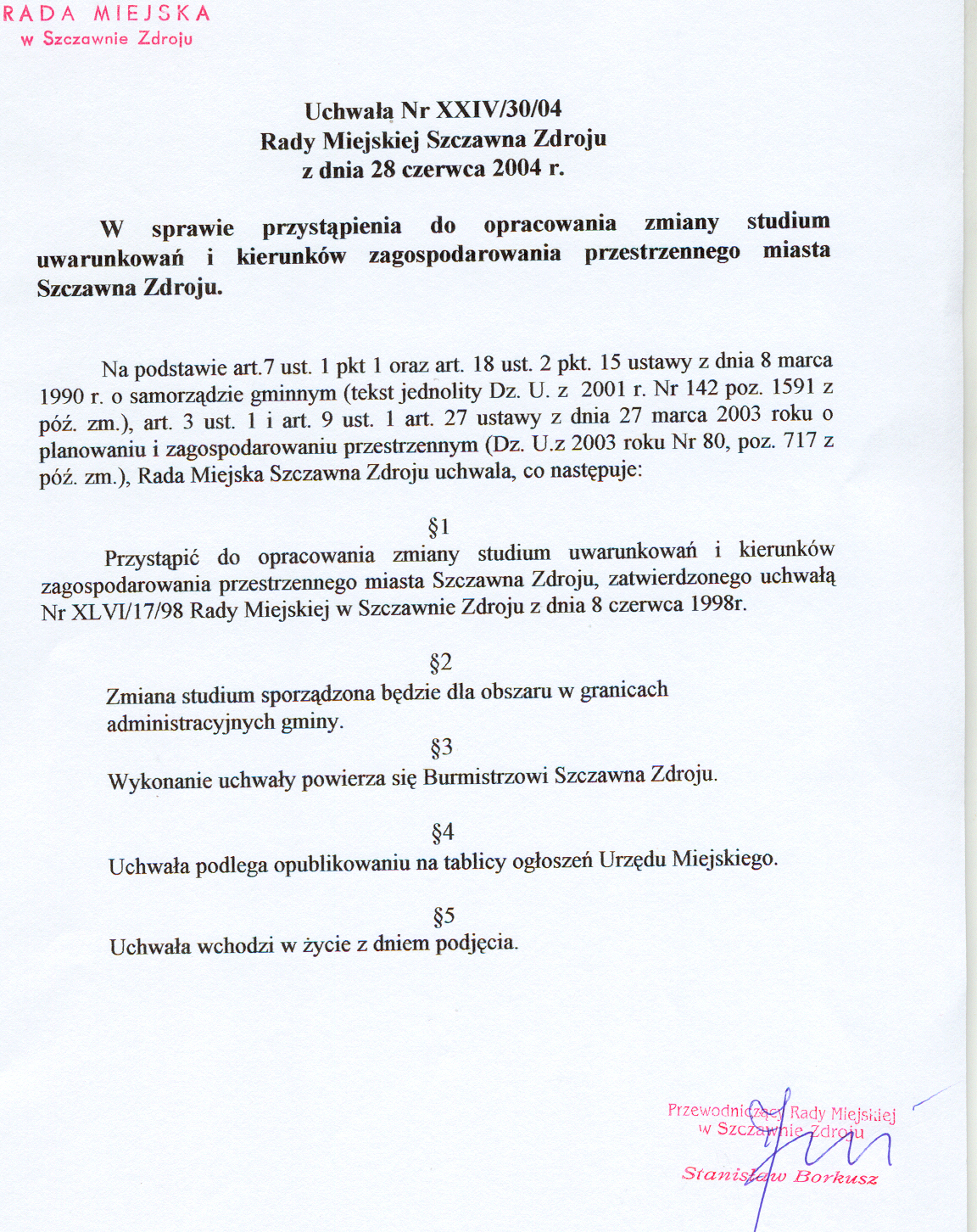 Uchwała nr XXIV/30/04 Rady Miejskiej w szczawnie Zdroju z dnia 28 czerwca 2004 r. w sprawie przystąpienia do opracowania zmiany studium uwarunkowań i kierunków zagospodarowania przestrzennego miasta