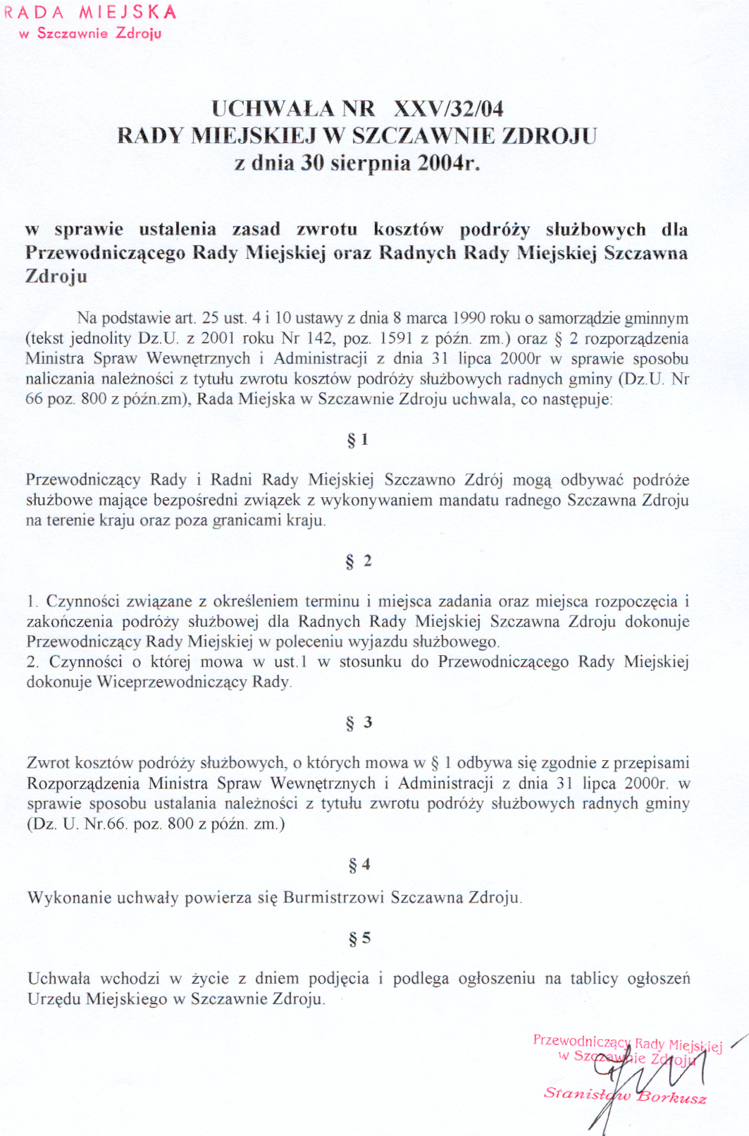 Uchwała nr XXV/32/04 Rady Miejskiej Szczawna Zdroju z dnia 30 sierpnia 2004 r. w sprawie ustalenia zasad zwrotu kosztów podróży służbowych dla Przewodniczącego Rady Miejskiej oraz Radnych