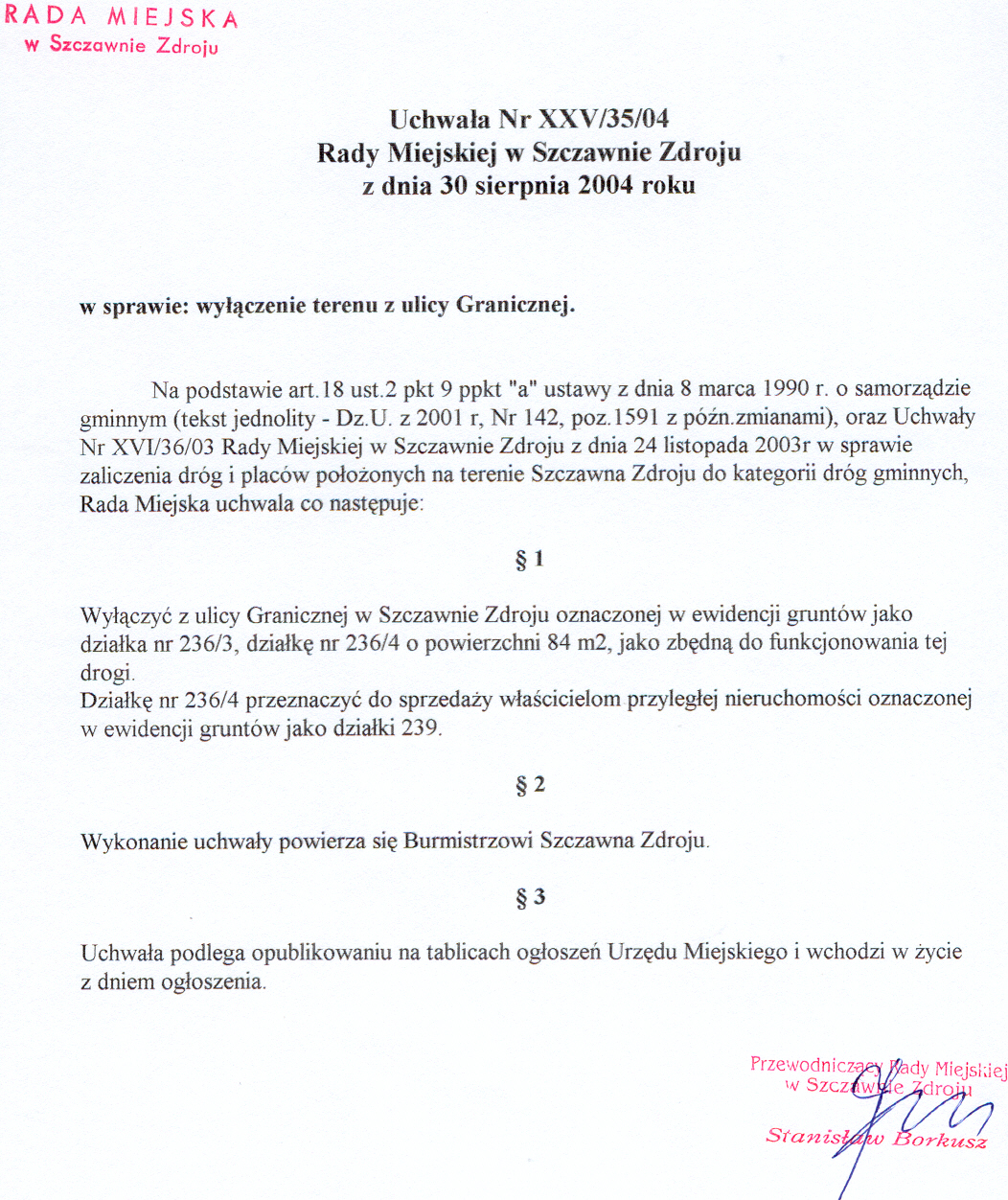 Uchwała nr XXV/35/04 Rady Miejskiej Szczawna Zdroju z dnia 30 sierpnia 2004 r. w sprawie wyłączenia terenu z ulicy Granicznej