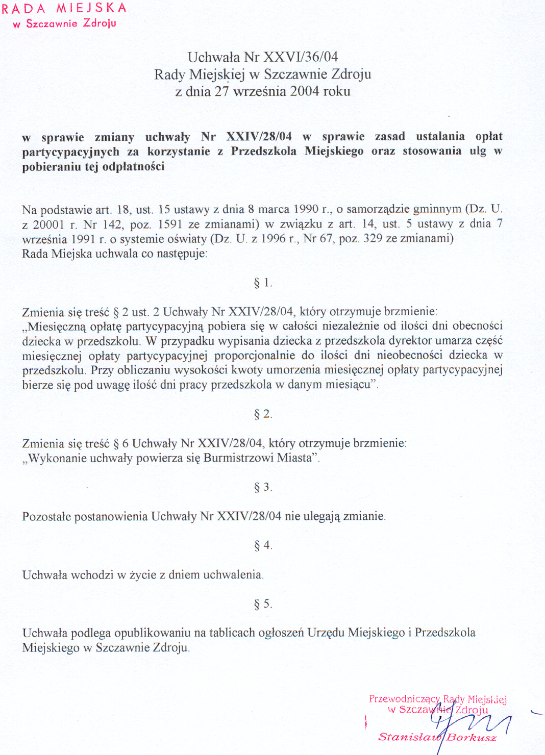 Uchwała nr XXVI/36/04 Rady Miejskiej w Szczawnie Zdroju z dnia 27 września 2004 r. w sprawie zmiany uchwały nr XXIV/28/04 w sprawie zasad ustalania opłat partycypacyjnych za korzystanie z Przedszkola Miejskiego oraz stosowania ulg w pobieraniu tej odpłatności - nieważność § 1 uchwały stwierdzona rozstrzygnięciem nadzorczym Wojewody Dolnośląskiego