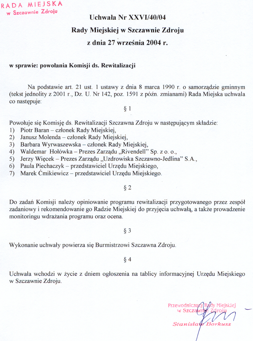 Uchwała nr XXVI/40/04 Rady Miejskiej w Szczawnie Zdroju z dnia 27 września 2004 r. w sprawie powołania Komisji ds. Rewitalizacji - nieważność uchwały stwierdzona rozstrzygnięciem nadzorczym Wojewody Dolnośląskiego
