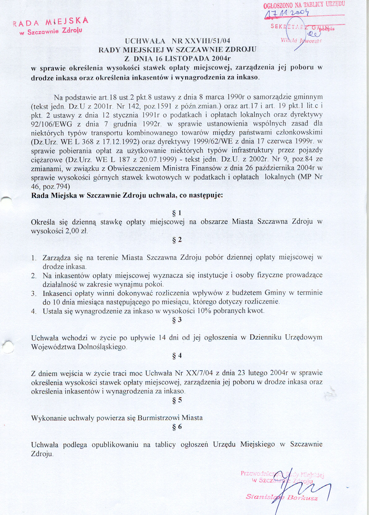Uchwała Nr XXVIII/51/04 Rady Miejskiej w Szczawnie Zdroju z dnia 16 listopada 2004 r. w sprawie określenia wysokości stawek opłaty miejscowej, zarządzania jej poboru w drodze inkasa oraz określenia inkasentów i wynagrodzenia za inkaso - nieważność uchwały stwierdzona rozstrzygnięciem nadzorczym Wojewody Dolnośląskiego