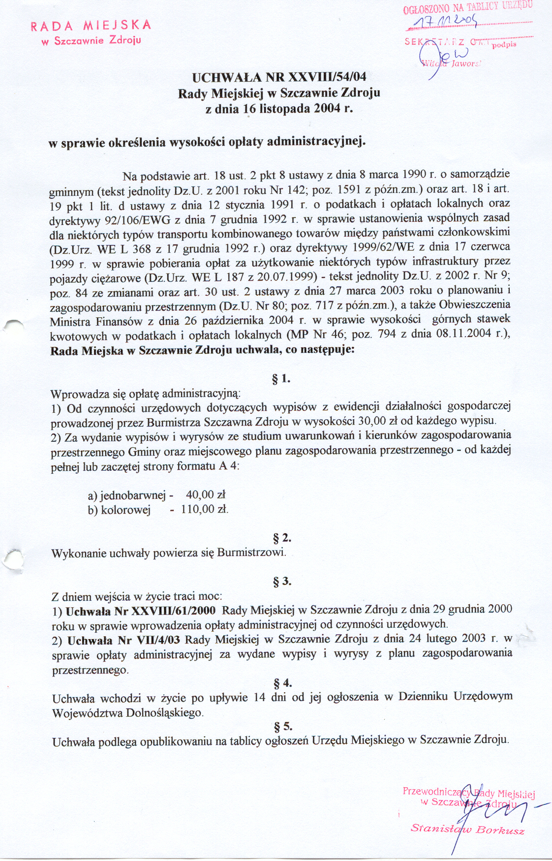 Uchwała Nr XXVIII/54/04 Rady Miejskiej w Szczawnie Zdroju z dnia 16 listopada 2004 r. w sprawie określenia wysokości opłaty administracyjnej