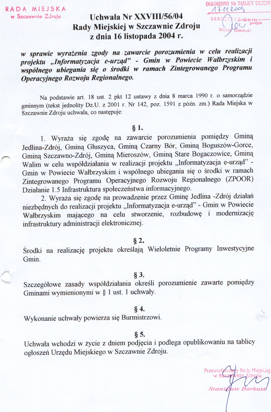 Uchwała Nr XXVIII/56/04 Rady Miejskiej w Szczawnie Zdroju z dnia 16 listopada 2004 r. w sprawie wyrażenia zgody na zawarcie porozumienia w celu realizacji projektu Informatyzacja e-urząd