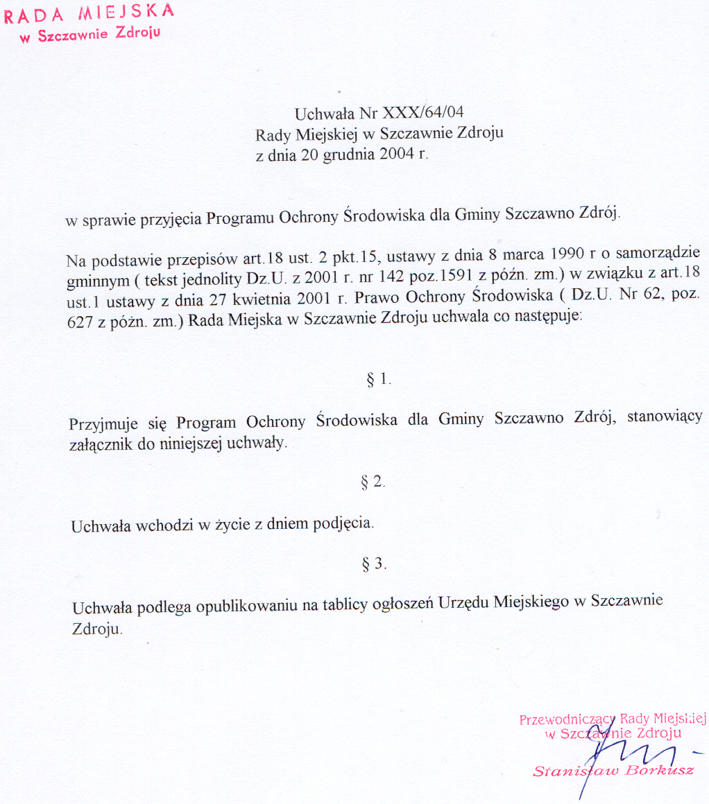 Uchwała Nr XXX/64/04 Rady Miejskiej w Szczawnie Zdroju z dnia 20 grudnia 2004 r. w sprawie przyjęcia Programu Ochrony Środowiska dla Gminy Szczawno Zdrój