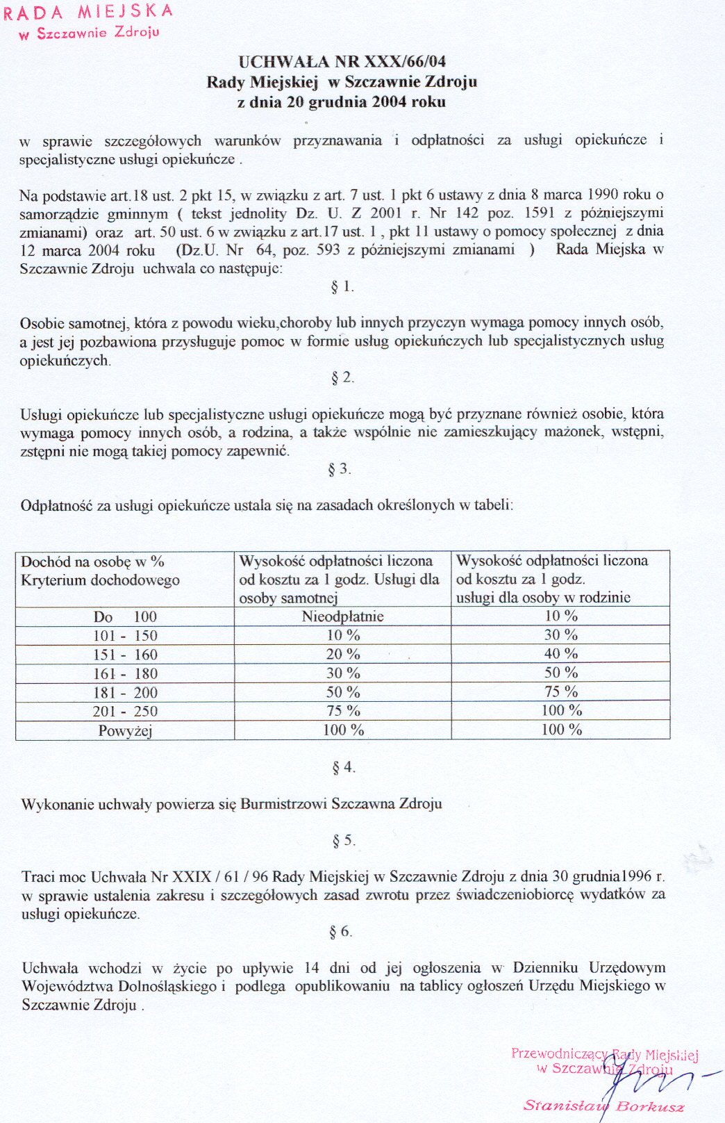 Uchwała Nr XXX/66/04 Rady Miejskiej w Szczawnie Zdroju z dnia 20 grudnia 2004 r. w sprawie szczegółowych warunków przyznawania i odpłatności za usługi opiekuńcze i specjalistyczne usługi opiekuńcze