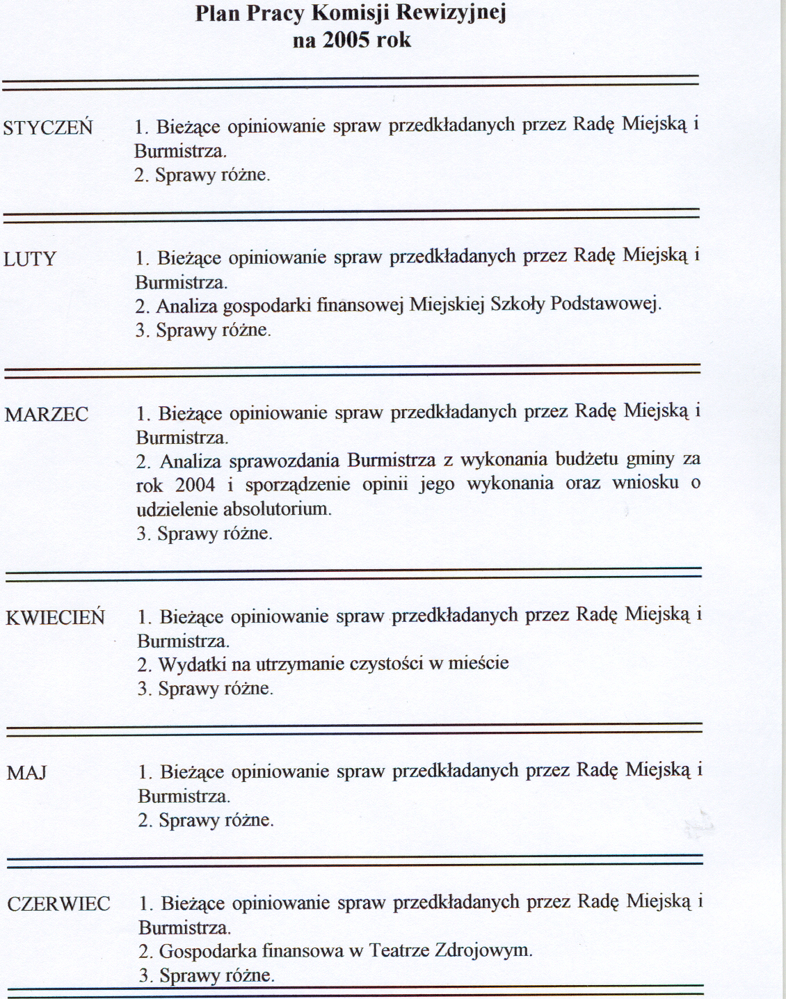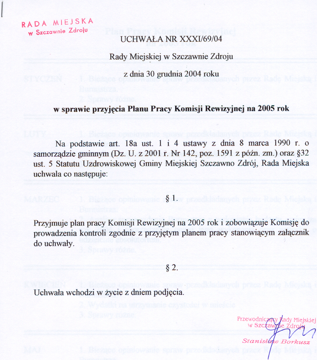 Uchwała Nr XXXI/69/04 Rady Miejskiej w Szczawnie Zdroju z dnia 30 grudnia 2004 r. w sprawie przyjęcia Planu Pracy Komisji Rewizyjnej na 2005 rok