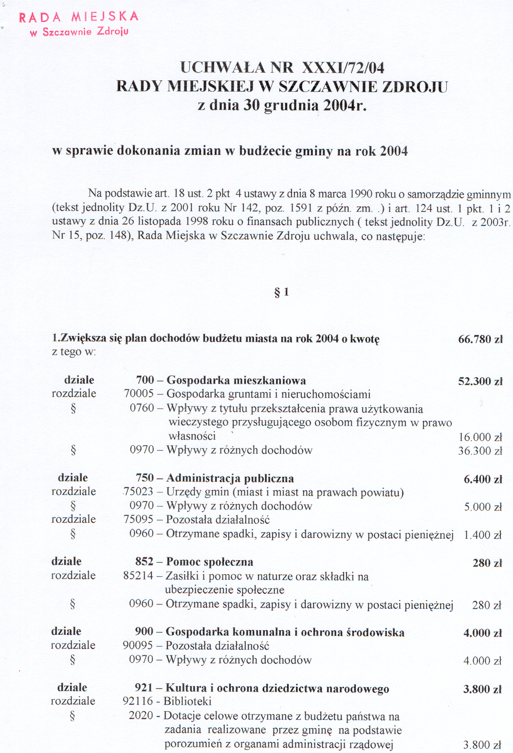 Uchwała Nr XXXI/72/04 Rady Miejskiej w Szczawnie Zdroju z dnia 30 grudnia 2004 r. w sprawie dokonania zmian w budżecie gminy na rok 2004
