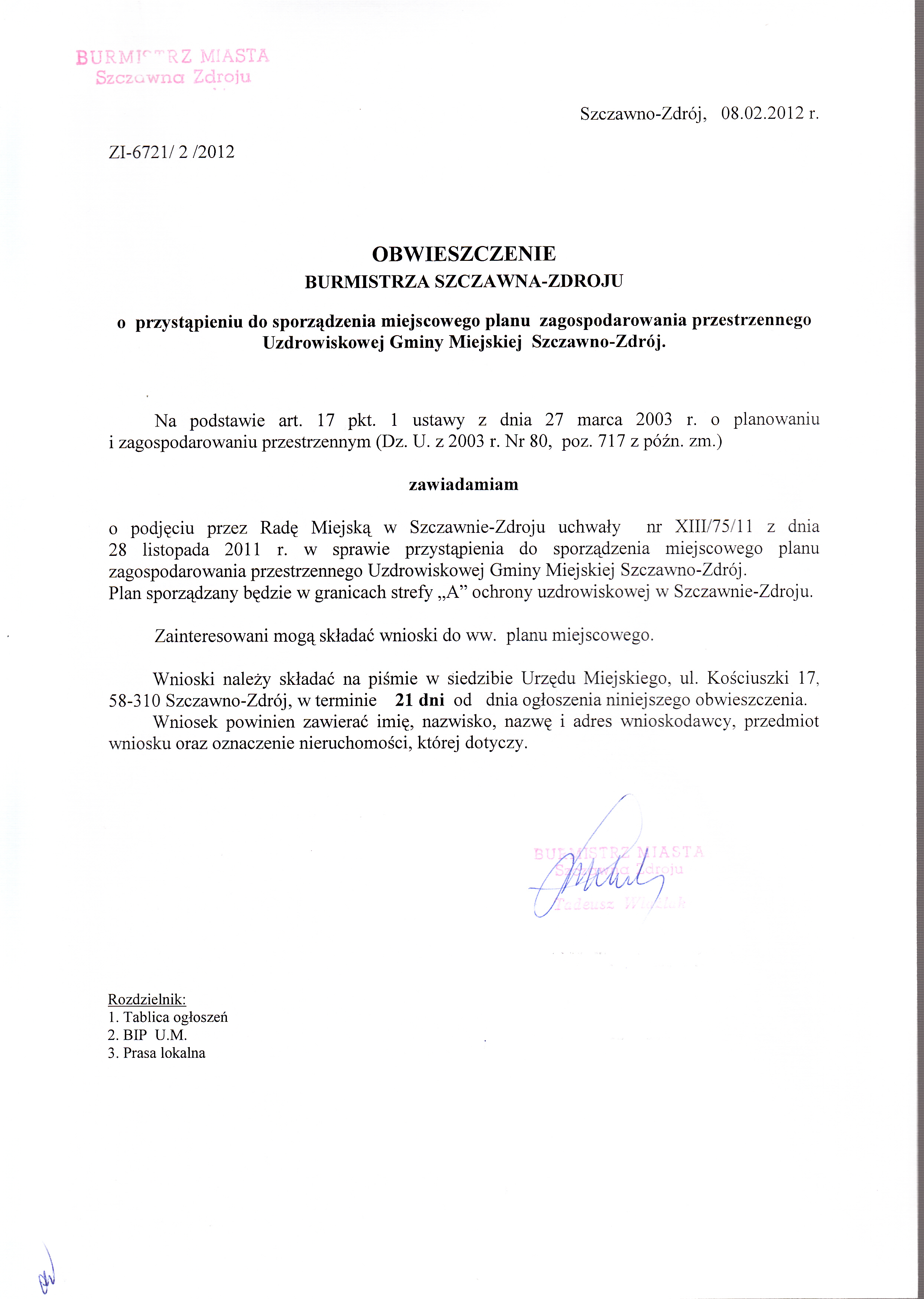 Obwieszczenie Burmistrza Szczawna-Zdroju o przystąpieniu do opracowania projektu miejscowego planu zagospodarowania przestrzennego Uzdrowiskowej Gminy Miejskiej Szczawno-Zdrój wraz z prognozą oddziaływania na środowisko