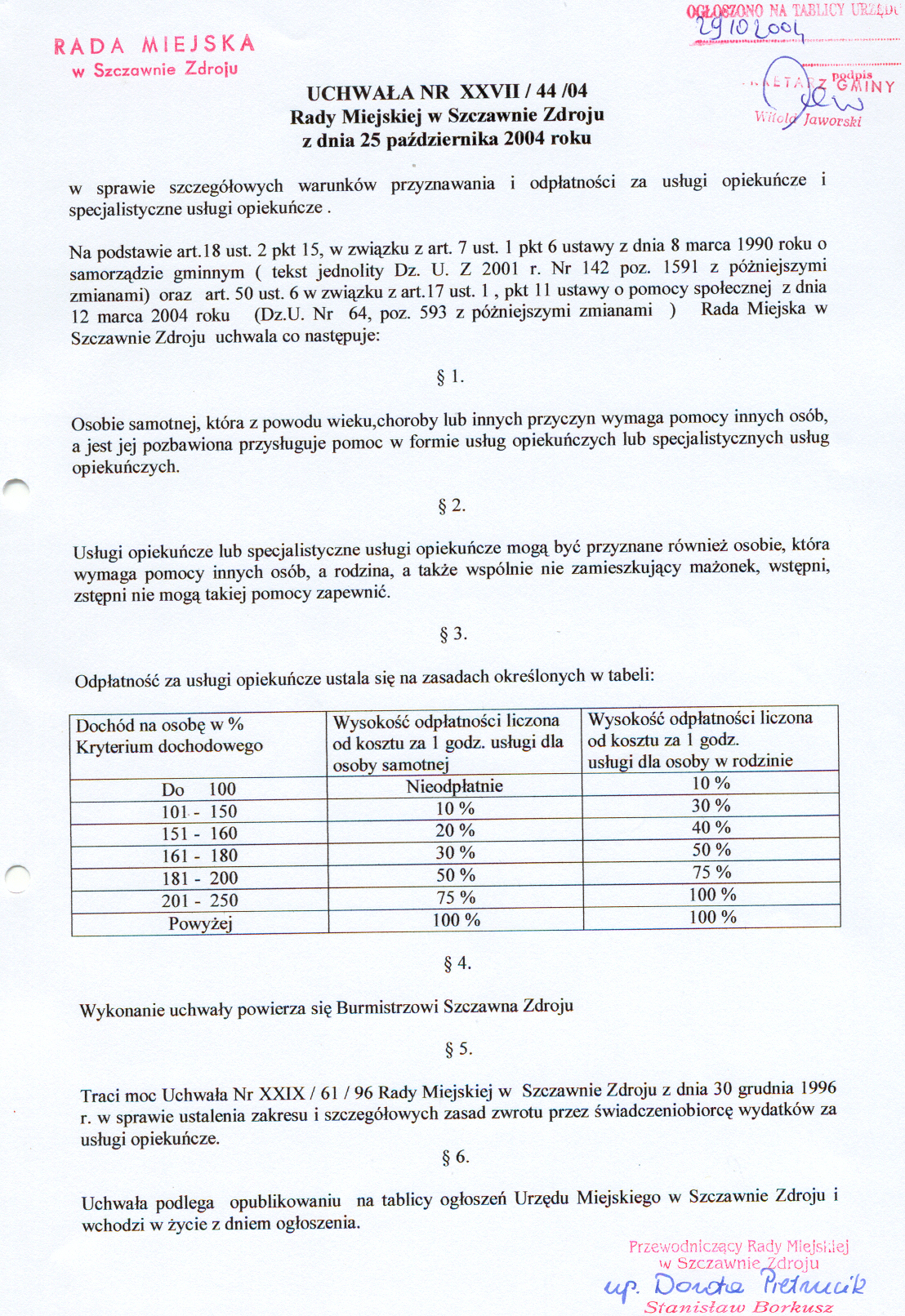 Uchwała nr XXVII/44/04 Rady Miejskiej w Szczawnie Zdroju z dnia 25 października 2004 r. w sprawie szczegółowych warunków przyznawania i odpłatności za usługi opiekuńcze i specjalistyczne usługi - nieważność uchwały stwierdzona rozstrzygnięciem nadzorczym Wojewody Dolnośląskiego